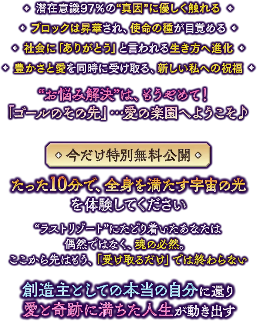 「変われるわけない」と笑われた。 でも──10分後、私の人生は変わった。 人知れず、生きづらさを抱えてきたあなたへ… ラストリゾート・意識進化の最後の楽園 意識構造心理学 × ハイパーバイオレゾナンス • 最短:わずか10分で • 根本:潜在意識97%の"真因"に直接アプローチ • 定着:再発しない「新しい在り方」を実現 深い問題が、"早く・根本から・再発なく"解決する 新時代の方法を無料公開!! 「もうダメだ」と思い込んでいた絶望すら──ただの幻だった たった10分で、長年の悩み・苦しみを解き放ち、"二度と戻らない"人生のパラダイムシフトが起こる